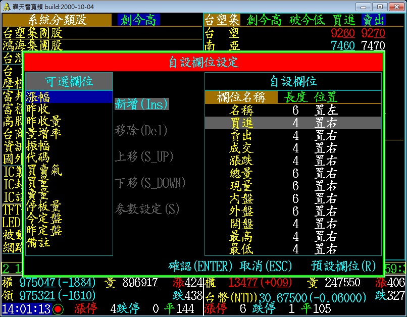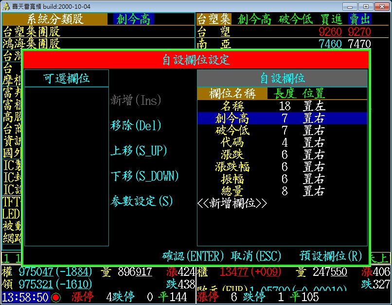 2. 分類股漲跌幅(Ctrl+Q)報價畫面新增"創今高"、"破今低"欄位。