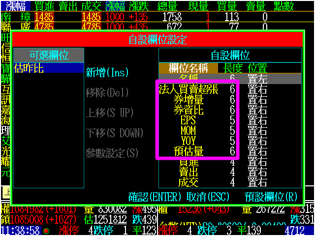 個股報價欄位新增: YOY(月營收年成長率)、 MOM(月營收月成長率) 、 EPS、券資比、券增量、法人買賣超、預估量、估昨比等資訊,可按【-】鍵進入【自設欄位設定】加入欄位查看。