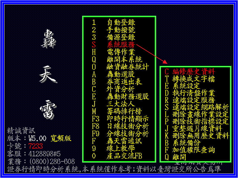 電傳更版: 為隨時將本公司研發的新功能及服務資訊,透過電傳作業中的轟天雷通訊,通知使用者可更換新的版本。另,「每日電傳」作業也將告知。一旦得知有新版本,執行「電傳更版」即可。 並可在「系統服務」中的「轟天雷通訊」之「轟天雷換版功能說明」中有更詳細的說明。