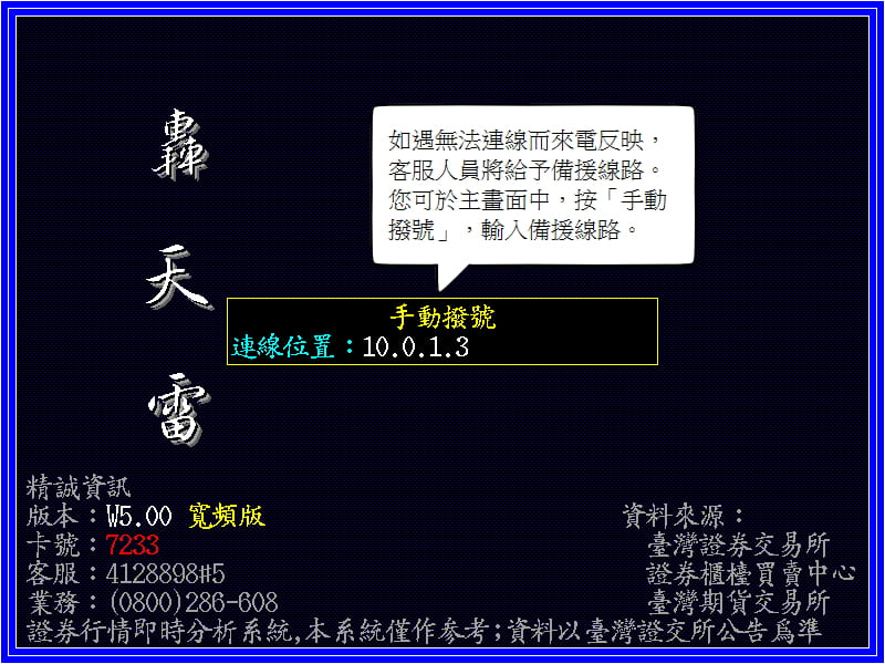 如畫面出現 ◤連線出現狀況不正常◢ 或一直顯示 ◤登錄中…◢;請先檢查您的網路是否正常;網路正常可嘗試 ◤備源登陸◢ 去連結第 2 伺服器;若還是無法正常連線,請電洽客服,若是因為伺服器發生問題,客服回給於您一組 IP:xxx.xxx.xxx.xxx;選取主畫面 => 手動撥號 => 輸入取得 IP 即可。