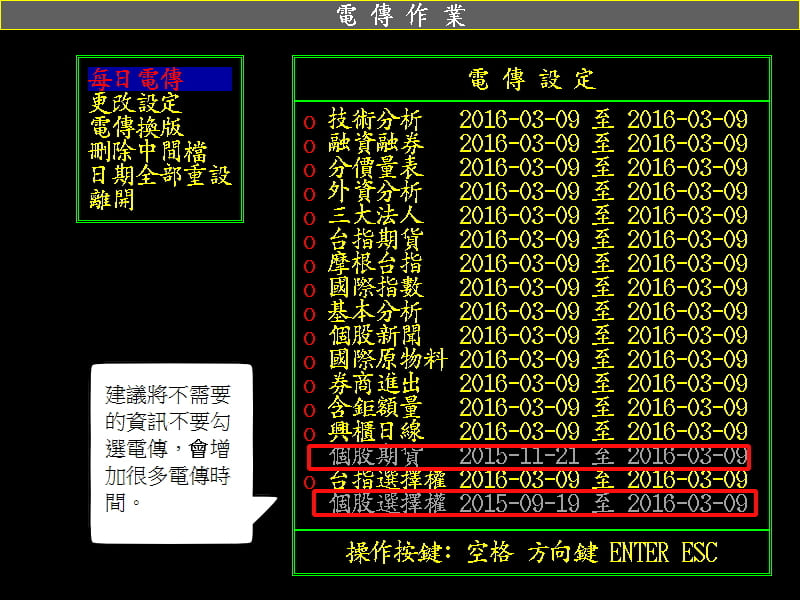 如無交易權證,建議不要勾選電傳,因光權證數量介於1-2萬支,會增加很多電傳時間。