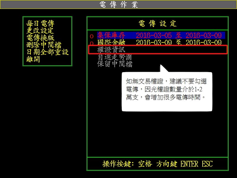 每日電傳 : 確定連線無誤後,進入電傳作業,游標停在「每日電傳」上,確定所需資料,日期設定無誤後,按