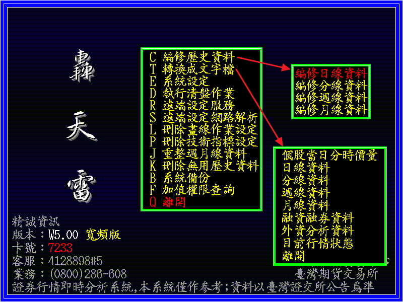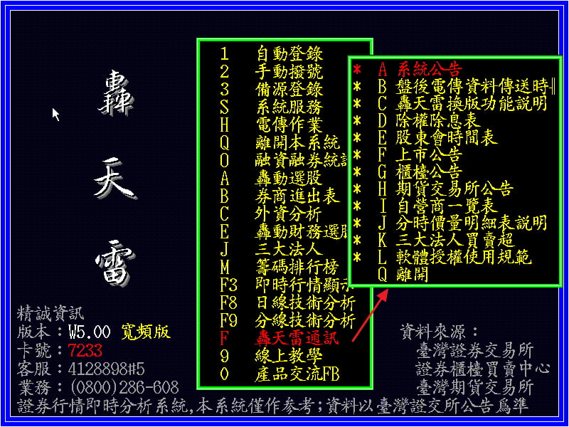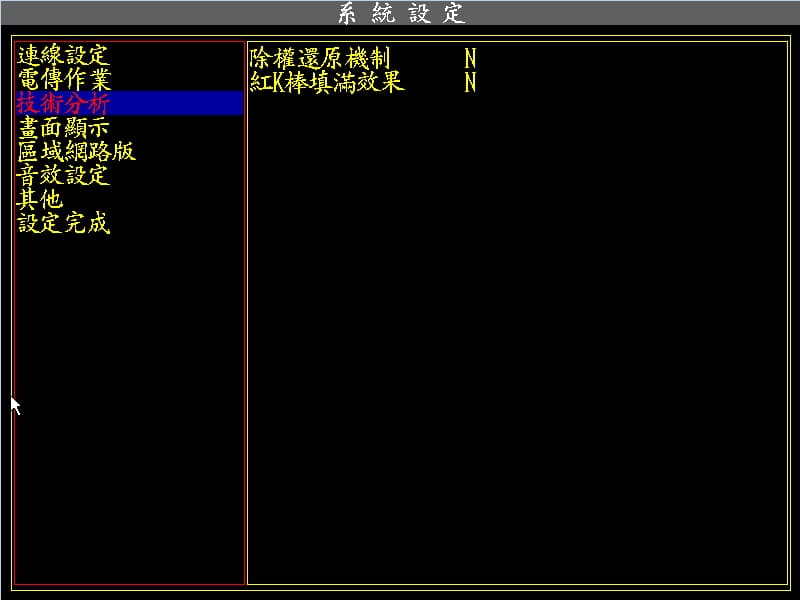 鍵移動游標至「技術分析」、「融資融券」、「分價 量表」、「傳輸斷線」等項目,按