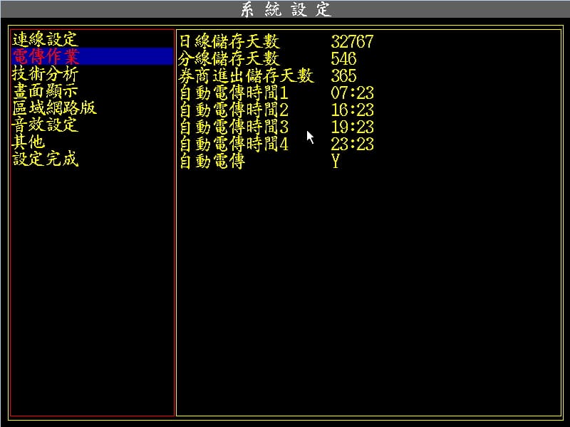 電傳作業:可以設定日線、分線、券商進出表儲存天數,並且設定自動電傳時間共計四個時段,指定 是否要自動啟動電傳作業等。(啟動本服務,轟天雷程式不可離開,可最小化)