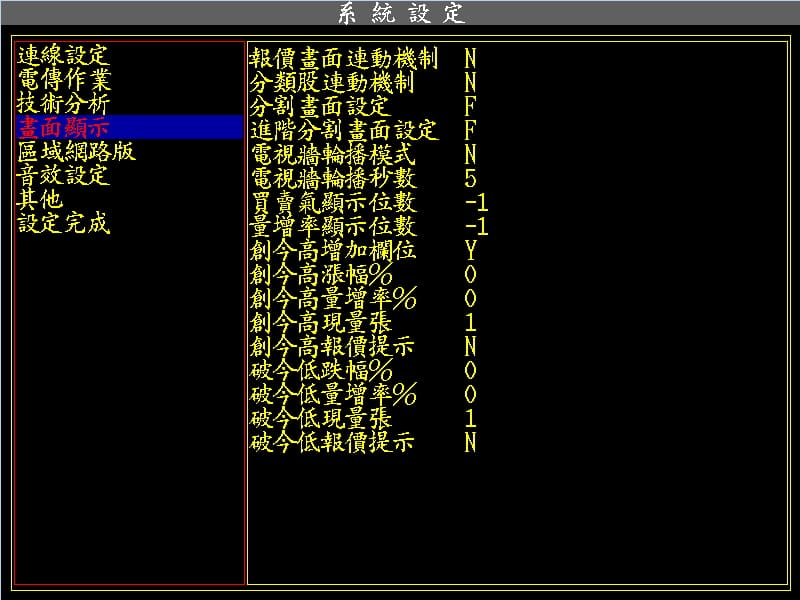 畫面顯示:可以設定報價畫面連動機制、分割畫面設定、進階分割畫面設定、設定股價條件(成立時會在報價畫面達到條件股票下方以各種不同顏色線條表示:如下圖所示)