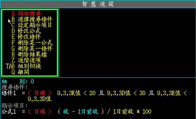 2. 提供 100 個「條件」項目及 100 個「公式」項目,讓使用者自行設定,利用「條件」找出符合的股票, 再用「公式」顯示出該股之各種資訊,如收、開、高、低、量、KD 等。