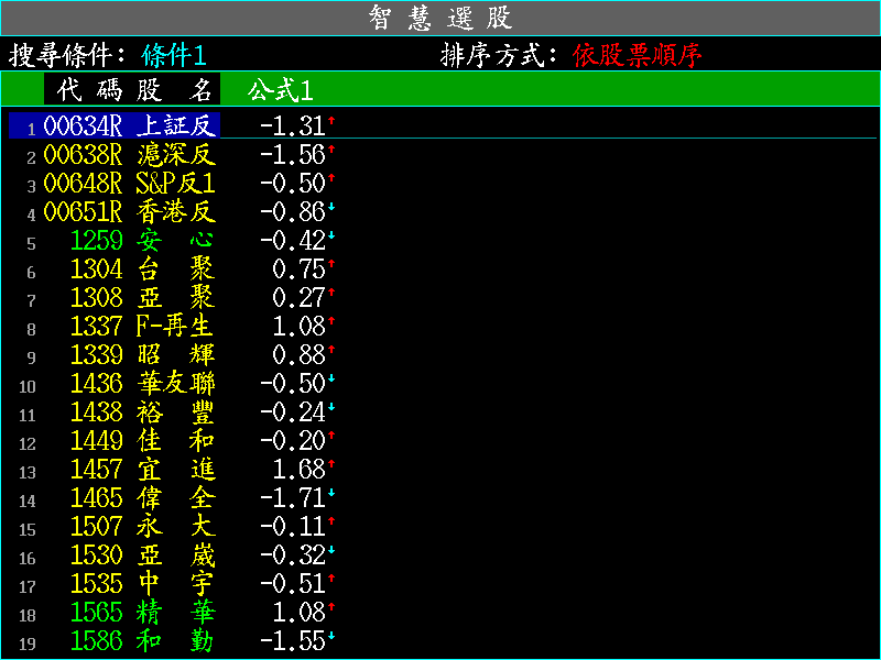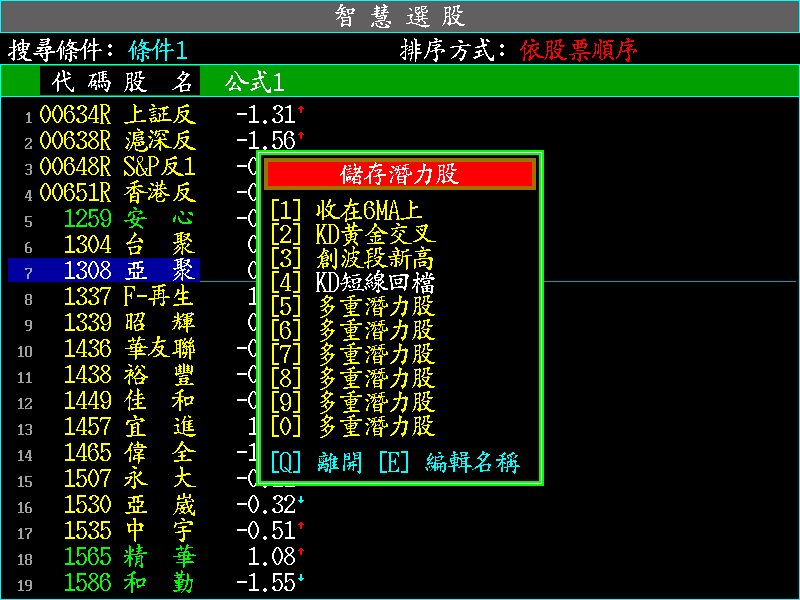 1. 在任何即時行情(按 鍵)中,按 + ,出現自行設定智慧選股條件搜尋結果。